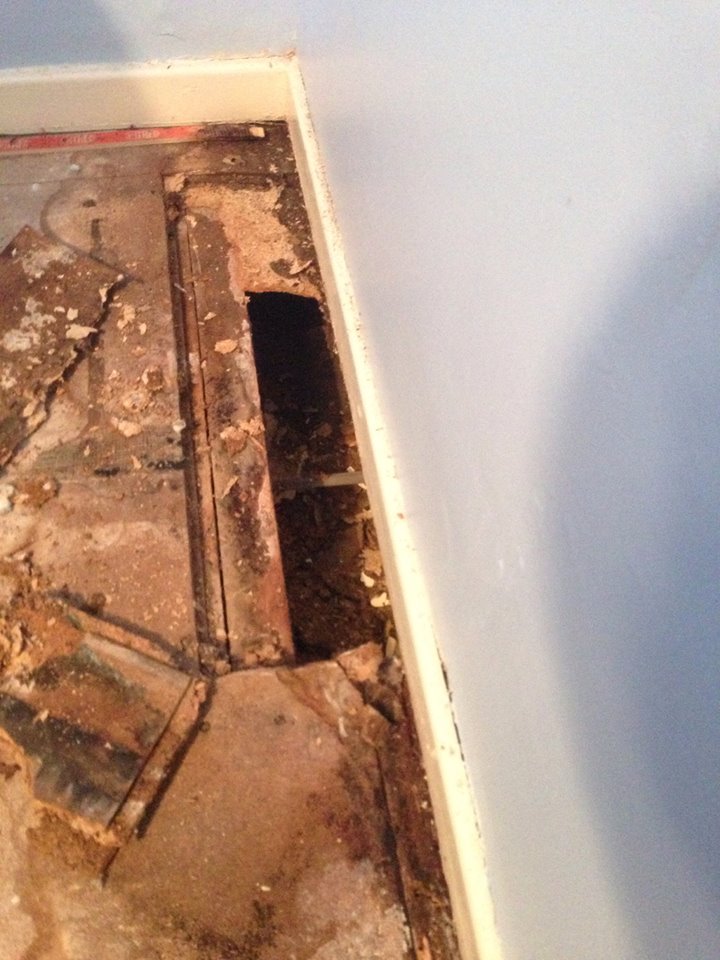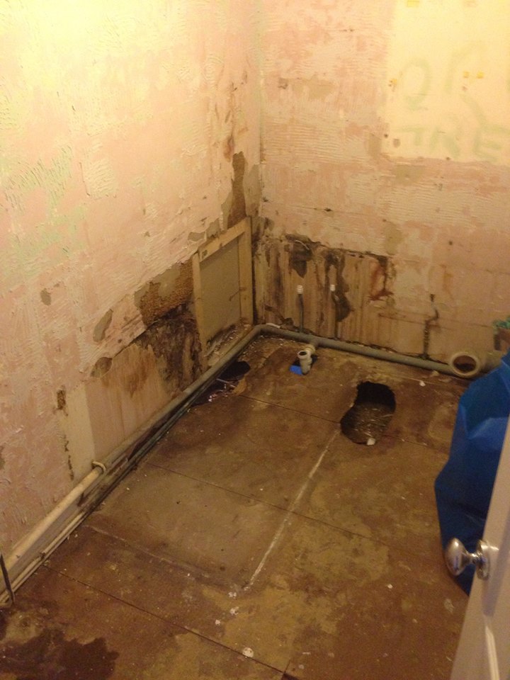 We have removed the bath and lifted the Lino we have found that the flooring is all rotten, there has been a leak from where the bath meets the wall and from the corner of the shower curtain. It was that bad that it had spread into the bedroom next door, put a hole in the ceiling below and become that weak that holes were appearing through disintegration.
